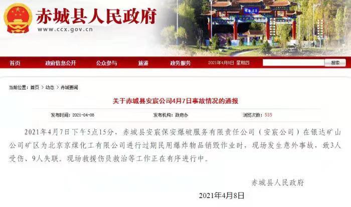 4月7日下午5點15分,赤城縣某爆破公司在銀達(dá)礦山公司礦區(qū)為北京某化工公司進(jìn)行過期民用爆炸物品銷毀作業(yè)時,現(xiàn)場發(fā)生意外事故,致3人受傷、9人失聯(lián)。 3人受傷,9人失聯(lián) 這些數(shù)字足以敲響安全警鐘 4月8日晚8時許,記者從一名失聯(lián)人員親屬處了解到,失聯(lián)人員搜救工作已經(jīng)基本結(jié)束,9名失聯(lián)人員已確認(rèn)遇難。 銀達(dá)礦山公司另一位工作人員證實了這一說法,“今天白天,失聯(lián)的9個人都找到了,都已經(jīng)拖走了!惫ぷ魅藛T稱,事發(fā)地離公司所在地有近十里路,他還曾嘗試到事發(fā)礦區(qū)去看一看,因現(xiàn)場有警察站崗,他沒能進(jìn)入事發(fā)礦區(qū)。 目前尚不清楚這次事故的導(dǎo)火索究竟是操作步驟出現(xiàn)了問題,還是公司管理有缺陷,但是安全警鐘已經(jīng)敲響,企業(yè)和員工要提高警惕。