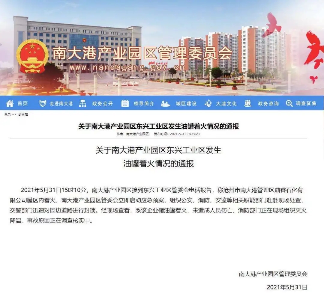 據(jù)河北滄州市南大港產(chǎn)業(yè)園區(qū)管理委員會(huì)官網(wǎng)消息,5月31日15時(shí)10分,南大港產(chǎn)業(yè)園區(qū)接到東興工業(yè)區(qū)管委會(huì)電話報(bào)告,稱滄州市南大港管理區(qū)鼎睿石化有限公司罐區(qū)內(nèi)著火,南大港產(chǎn)業(yè)園區(qū)管委會(huì)立即啟動(dòng)應(yīng)急預(yù)案,組織公安、消防、安監(jiān)等相關(guān)職能部門趕赴現(xiàn)場處置,交警部門迅速對周邊道路進(jìn)行封鎖。 經(jīng)現(xiàn)場查看,系該企業(yè)儲(chǔ)油罐著火,未造成人員傷亡,消防部門正在現(xiàn)場組織滅火降溫。事故原因正在調(diào)查核實(shí)中。 據(jù)南大港產(chǎn)業(yè)園區(qū)管理委員會(huì)網(wǎng)站介紹,南大港產(chǎn)業(yè)園區(qū)位于河北省滄州市東北部,渤海灣西岸,面積296平方公里。南大港產(chǎn)業(yè)園區(qū)是大港油田主產(chǎn)區(qū),擁有豐富的石油、天然氣資源。
