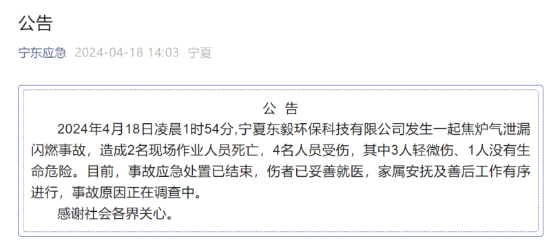2024年4月18日凌晨1時54分,寧夏東毅環(huán)?萍加邢薰景l(fā)生一起焦?fàn)t氣泄漏閃燃事故,造成2名現(xiàn)場作業(yè)人員死亡,4名人員受傷,其中3人輕微傷、1人沒有生命危險。目前,事故應(yīng)急處置已結(jié)束,傷者已妥善就醫(yī),家屬安撫及善后工作有序進(jìn)行,事故原因正在調(diào)查中。 據(jù)了解,寧夏東毅環(huán)?萍加邢薰臼菍氊S能源集團(tuán)旗下的企業(yè)。該公司成立于2010年11月01日,位于寧夏寧東能源化工基地寶豐能源循環(huán)經(jīng)濟(jì)項目區(qū)。 2024年1月31日,寧夏寶豐能源集團(tuán)股份有限公司精細(xì)化工廠曾發(fā)生一起爆燃事故,造成現(xiàn)場臨近的2名巡檢人員受輕傷。事故發(fā)生后,寶豐公司立即啟動應(yīng)急響應(yīng),14分鐘火情解除,事故得到有效處置,未發(fā)生次生災(zāi)害。