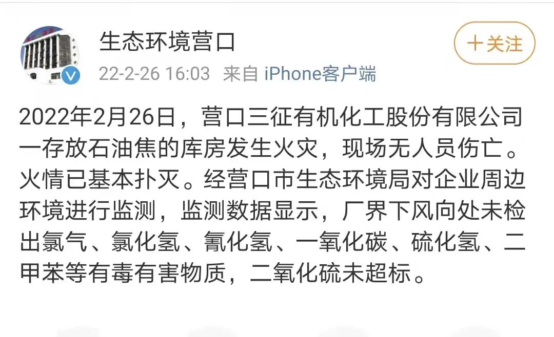 2022年2月26日上午11點40許,大石橋市三征有機化工股份有限公司一庫房著火。目前沒有人員傷亡,火勢已基本控制,火災(zāi)原因正在調(diào)查。 遼寧三征化學(xué)有限公司系三征有機化工股份有限公司的下屬公司。其官方網(wǎng)站信息顯示,該公司地址位于遼寧省大石橋市水源鎮(zhèn)黑英臺村,是國家農(nóng)藥定點生產(chǎn)企業(yè),是集原藥及制劑研發(fā)和生產(chǎn)于一體的現(xiàn)代化生產(chǎn)企業(yè),多年來專注于農(nóng)藥除草劑的開發(fā)應(yīng)用,擁有多種制劑產(chǎn)品,相繼開發(fā)了乳油、水劑、懸乳劑、油懸劑、微乳劑、可濕性粉劑、水分散粒劑等多種劑型,產(chǎn)品涵蓋了玉米、大豆、水稻、花生、甘蔗、和經(jīng)濟作物等多種除草劑品種60多個,規(guī)格400多種,年生產(chǎn)能力原藥1萬噸,制劑3.5萬噸。 2月26日下午,記者多次撥打遼寧三征化學(xué)有限公司官方網(wǎng)站上公布的辦公電話,均顯示電話已關(guān)機。 大石橋市水源鎮(zhèn)鎮(zhèn)政府工作人員告訴記者,當(dāng)?shù)氐娜骰瘜W(xué)確實出了事故,目前有關(guān)部門的領(lǐng)導(dǎo)都在現(xiàn)場參與救援,但有無人員受傷等詳細情況他均不清楚。