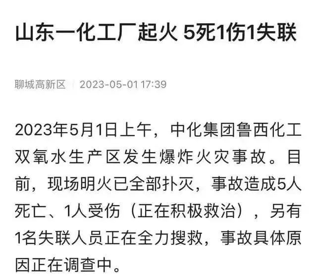 5月1日上午8點30分左右,有聊城市茌平區(qū)和東阿縣的網(wǎng)友忽然聽到一聲巨響,震得門窗亂晃。隨后,網(wǎng)上傳出多段疑似魯西化工區(qū)域濃煙滾滾的視頻。 在當?shù)匾粋區(qū)域頭條群,有很多購買了魯西化工股票的網(wǎng)友有點恐慌,交流中可以看出希望這是條假消息。 據(jù)當?shù)匾晃淮迕穹Q,聽到響聲時他在離工業(yè)園區(qū)7公里外的東阿縣城,12點左右,他到現(xiàn)場時看到火已經(jīng)滅掉,濃煙也已止住,現(xiàn)場有消防車作業(yè),并有多輛救護車出入。 下午5點39分,據(jù)魯西化工所在地聊城市高新區(qū)官方發(fā)布,中化集團魯西化工雙氧水生產(chǎn)區(qū)發(fā)生的爆炸火災(zāi)事故,已經(jīng)造成了5人死亡、1人受傷,另有1名失聯(lián)人員正在全力搜救。 有網(wǎng)友轉(zhuǎn)發(fā)到頭條群的山東應(yīng)急管理發(fā)布的一篇微博顯示,4月29日,聊城市應(yīng)急局局長曾帶隊到魯西化工督導(dǎo)檢查“五一”假期期間安全生產(chǎn)工作,強調(diào)生產(chǎn)經(jīng)營單位落實安全防范措施,在前期工作的基礎(chǔ)上對當前安全生產(chǎn)工作再部署、再落實、再推進,嚴防各類事故發(fā)生。 事故警示信息 2023年5月1日8時36分許,山東聊城魯西化工雙氧水新材料科技有限公司1號雙氧水裝置發(fā)生爆炸,已造成重大人員傷亡。事故原因初步分析為,雙氧水裝置工作液配置釜用于回收工作液時,吸入大量70%濃度雙氧水,釜內(nèi)可能存在雜質(zhì)造成雙氧水劇烈分解,引發(fā)配置釜超壓爆炸,造成現(xiàn)場人員傷亡,并波及相鄰企業(yè)辛醇儲罐及部分管線泄漏燃燒,詳細原因正在調(diào)查中。 各地區(qū)、有關(guān)企業(yè)要深刻吸取事故教訓(xùn),舉一反三,迅速落實重大隱患排查治理專項行動部署,切實強化重大風險管控,堅決防范遏制重特大事故。一是聚焦雙氧水工作液配置釜、氫化塔、氧化塔等重點部位和加氫,過氧化,工作液回收等事故易發(fā)環(huán)節(jié),強化隱患排查治理,落實風險管控措施。二是嚴格檢維修管理,節(jié)日期間原則上不得開展動火等特殊作業(yè),確需開展的要提級管理并嚴格落實GB30871相關(guān)要求。三是嚴格限制裝置區(qū)人員數(shù)量,特別是存在爆炸風險的化工裝置區(qū)嚴禁人員聚集扎堆。 地方各級應(yīng)急部門要主動研判本地區(qū)危化品安全風險,全面摸排、監(jiān)督落實安全措施;充分利用風險監(jiān)測預(yù)警系統(tǒng)在線巡查、明查暗訪、舉報獎勵等手段,及時發(fā)現(xiàn)查處違法違規(guī)行為,為安全生產(chǎn)形勢平穩(wěn)提供有力保障。請各地區(qū)迅速將事故警示信息傳遞給有關(guān)企業(yè)。