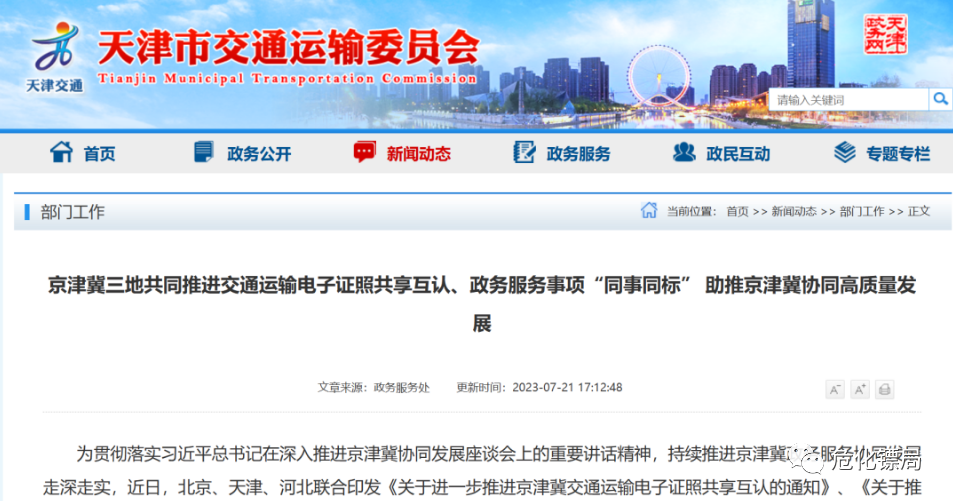 三地互認日前,北京市、天津市、河北省聯(lián)合印發(fā)《關于進一步推進京津冀交通運輸電子證照共享互認的通知》《關于推出京津冀交通運輸領域首批“同事同標”事項的通知》。目前,經(jīng)三地核發(fā)的五大類電子證照已實現(xiàn)三地互認:1、道路運輸經(jīng)營許可證2、道路運輸證3、道路運輸從業(yè)人員從業(yè)資格證4、道路危險貨物運輸許可證5、放射性物品道路運輸許可證